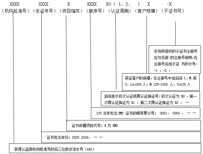 C.1 EMS 认证证书编号由认证机构批准号 、获证年份号 、EMS 英文缩写、顺序号 、认证周期、客户规模和子证书号构成 ,格式如下:
