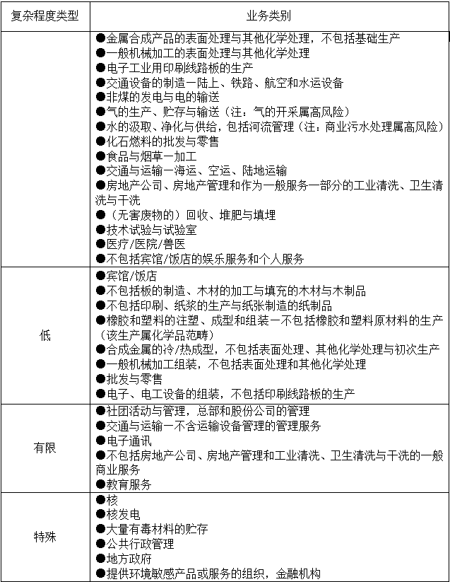 本机构了解,在一个特定行业中,并不是所有组织都属于相同的复杂程度类型。本机构的申请评审程序将具有一定的灵活性,以确保在确定组织的复杂程度类型时考虑该组织的具体活动。例如:虽然化工行业的许多组织均宜被归入“高风险”这一类,但如果某个组织只进行不产生化学反应或排放的混和作业,或者只从事贸易活动,那么该组织可以归入“中等复杂程度”甚至“低复杂程度”。本机构记录所有将特定行业中的组织归入较低复杂程度类型的情况。