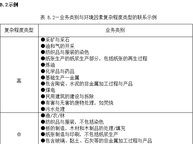 表 B.2 将上述5种复杂程度类型与每种类型所覆盖的典型行业做了对照。