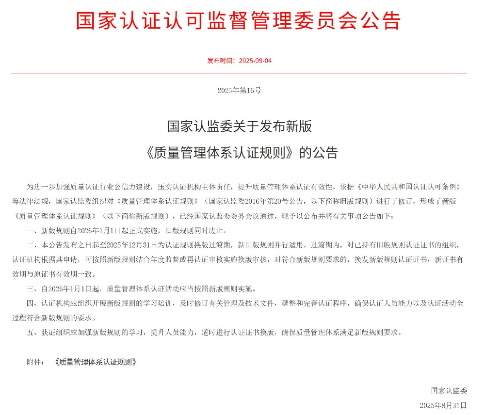 国家认监委关于发布新版《质量管理体系认证规则》的公告